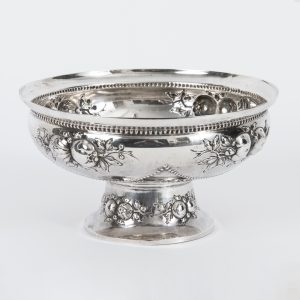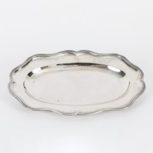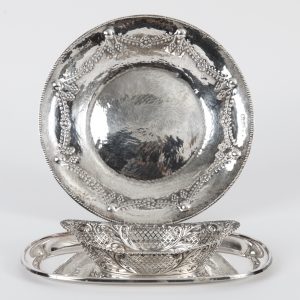 Drei verschiedene Silberschalen, u. a. London, England, 20. Jh.160,00 €Sterling and 800/- silver; total weight: approx. 355 g; three-piece group comprising: 1) Boat-shaped bowl with pierced wall featuring ornamental and floral decoration and an oval well; underside stamped with lion passant, London town mark, date letter 1872 and struck maker’s mark; dimensions: approx. 13.2 x 7 cm. 2) Serving bowl with hammered decoration, scalloped rim with encircling festoon, vine and floral decoration, and a fine continuous beaded border to the edge; rim stamped with lion passant, London town mark, date letter 1914 and maker’s mark Philip Frederick Alexander; diameter: approx. 18.8 cm. 3) Oval miniature tray with slightly flared rim; well stamped with crescent and crown, fineness mark “800” and unidentified maker’s mark; slightly indented rim over approx. 1 cm; dimensions: approx. 19.4 x 11.6 cm. All pieces with age-related signs of wear and oxidation residues.
