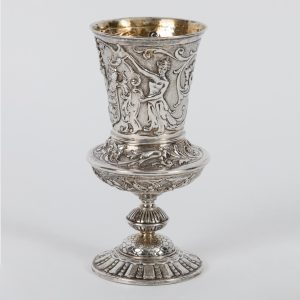 Antiker Kelch in Repoussé-Technik, vermutlich Niederlande, 18./ 19. Jh.180,00 €Silver alloy; weight: approx. 224 g; chalice on a round, rising foot, short stem with nodus and chalice base in compressed globular form with conical upper section; encircling relief ornament and figural decoration to the body; remains of interior gilding; body stamped with a rampant lion within a shield and an unidentified maker’s mark; good condition consistent with age and use, with oxidation residues; height: approx. 15.6 cm.