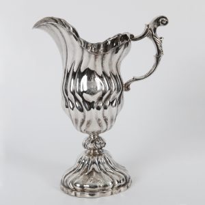 Antike silberne Helmkanne, Augsburg, 1765–67280,00 €Silver alloy; weight: approx. 408 g; helmet jug on a round, moulded base with nodus, pear-shaped body with curved gadrooned wall, broad spout and high-set volute handle; centrally engraved monogram “MS” with crown to the front; stamped to the upper rim with Augsburg town mark (pine cone and letter R) and an unidentified maker’s mark; age-related signs of wear and oxidation residues; height: approx. 22.5 cm.