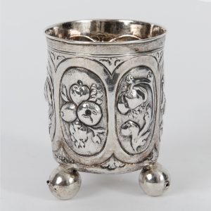 Kugelfußbecher mit reliefiertem Obst- und Floraldekor, 19. Jahrhundert220,00 €Silver alloy; weight: approx. 70 g; goblet standing on three hollow ball feet with straight-sided body and encircling relief fruit and floral decoration arranged in six adjacent oval reserves; remains of gilding; several dents of up to approx. 7 mm in length, age-related signs of wear; upper rim stamped with an unidentified and struck mark and bearing a tremble line; height: approx. 8.4 cm.
