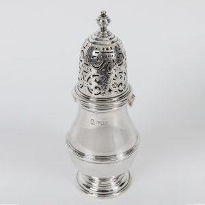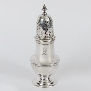 Großer silberner Zuckerstreuer, Salomon Joel Phillips Ltd, London, 1905330,00 €Sterling silver; weight: approx. 355 g; sugar caster with pear-shaped body and encircling moulded band, removable lid with Moorish-style pierced decoration, bayonet fitting and mushroom-shaped finial, standing on a round, domed and stepped base; age-related signs of wear; lid and body stamped with lion passant, town mark, date letter and maker’s mark; height: approx. 20.7 cm.