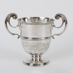 Silberner Pokal, Goldsmiths & Silversmiths Co., London, 1900380,00 €Sterling silver; weight: approx. 494 g; cup with conical body, centrally encircling stepped moulded band and high-set volute handles on both sides, standing on a round stepped base; stamped to the side with lion passant, town mark, date letter and maker’s mark, underside additionally with maker’s mark and engraved numbering; light age-related signs of wear and oxidation residues; height: approx. 16 cm.