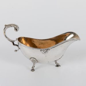 Kleine silberne Saucière, vermutlich Belgien, 20. Jh.120,00 €835/- silver; weight: approx. 128 g; silver sauce boat with curved body and floral decorative elements on both sides, broad spout and high-set volute handle, standing on three splayed feet with rocaille decoration; remains of interior gilding; small dent to the rim of approx. 1 mm as well as light signs of wear and oxidation residues; underside stamped with fineness mark and numbering; height: approx. 8.8 cm.
