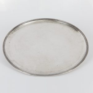 Rundes Silbertablett, C. Frey und Söhne, Breslau, 20. Jh.360,00 €13-lot silver; weight: approx. 543 g; round tray with slightly flared rim and encircling double-reeded border; age-related signs of wear and oxidation residues; underside at the rim stamped with maker’s mark, fineness mark and a struck punch, probably applied by the jeweller; diameter: approx. 28.5 cm.