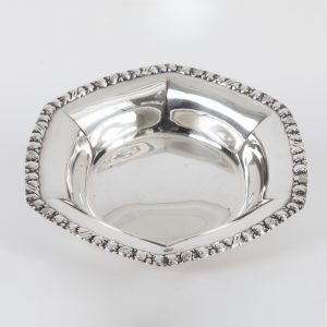 Silberne hexagonale Anbietschale, Gottlieb Kurz, Schwäbisch Gmünd, 20. Jh.330,00 €800/- silver; weight: approx. 444 g; serving bowl with circular well and scrolled, six-lobed rim with encircling relief floral decoration; light age-related signs of wear; underside stamped with crescent and crown, maker’s mark and fineness mark; height: approx. 5 cm; diameter: approx. 26.7 cm.