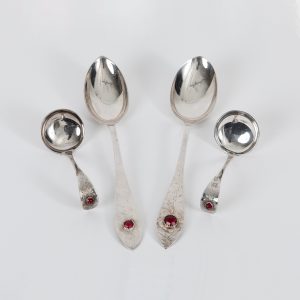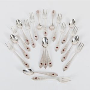 20-tlg. Konvolut Kuchengabeln und Teelöffel im Friesenmuster, Robbe & Berking, Flensburg, 20. Jh.330,00 €800/- silver; total weight: approx. 406 g; 10 teaspoons and 10 cake forks in the Friesen pattern, each set with a round red glass flux stone, on tapering handles with floral engraved decoration; fine surface scratches and light signs of wear; reverse stamped with crescent and crown, fineness mark and maker’s mark; length of the spoons: approx. 13.3 cm; length of the forks: approx. 14.5 cm.