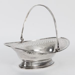 Paar silberne Bonbonschälchen, Henry Atkin & Co., Sheffield, 1905180,00 €Sterling silver; total weight: approx. 254 g; pair of bowls with conical bodies in diamond-shaped pierced decoration and laterally hinged ring-shaped handles, terminating in a wide rim with encircling corded border; light age-related signs of wear; handles and inner walls stamped with lion passant, town mark, date letter and maker’s mark, underside additionally with various engraved markings; height: approx. 4.7 cm.