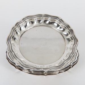 Drei versch. silberne Untersetzer, Otto Wolter, Schwäbisch Gmünd, und Koch & Bergfeld, Bremen, 20. Jh.180,00 €800/- silver; total weight: approx. 287 g; two drink coasters in Chippendale style with large circular wells and scrolled eight-lobed rims, underside stamped with crescent and crown, model number, maker’s mark, fineness mark and retailer’s mark; one coaster in Chippendale style with circular well and scrolled twelve-lobed rim, underside stamped with crescent and crown, Otto Wolter maker’s mark and fineness mark; age-related signs of wear and rubbing; diameter: approx. 15.2 to 15.7 cm.