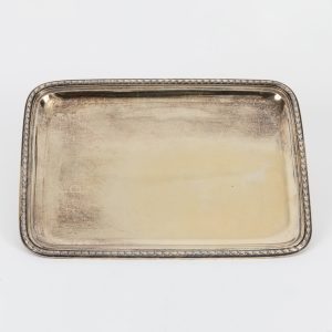 Vergoldetes Anbiettablett, Deutschland, 1. Hälfte 20. Jh.420,00 €925/- silver; weight: approx. 453 g; small serving tray of rounded rectangular form with slightly flared, stepped rim and encircling raised laurel decoration to the edge; heavy wear to the gilding and age-related signs of use; underside stamped with crescent and crown, unidentified maker’s mark and fineness mark; dimensions: approx. 23.2 x 17.1 cm.