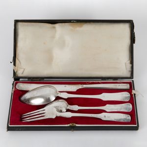Antikes Patenbesteck, Alexander Ferdinand Lux (1839–1864), Hamburg, Mitte des 19. Jh.60,00 €12-lot silver; total weight: approx. 72 g; four-piece cutlery set in spade pattern with the dedication “Ferdinande” to the end of the handle, comprising spoon (L: approx. 18.3 cm), knife (L: approx. 18.8 cm), teaspoon (L: approx. 15.1 cm) and fork (L: approx. 17.4 cm); age-related signs of wear; reverse of shaft or blade stamped with the Hamburg gate mark with letter “D” (1853-1865) and maker’s mark; housed in the original presentation case with engraved date 1862.