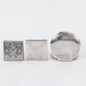 3 verschiedene silberne Schminketuis, 20. Jahrhundert90,00 €Various silver alloys; total weight: approx. 360 g; three-piece group of silver hinged vanity cases and pocket mirrors comprising: 1) Large round case with various reeded geometric patterns, interior with metal insert and unsecured round mirror, stamped to the elliptical thumb rest with a struck fineness mark (probably 900) and unidentified marks; diameter: approx. 10.1 cm. 2) Square pocket mirror with guilloché and floral engraved decoration to the front and reeded decoration to the reverse, narrow thumb press; inner rim of the lid stamped with fineness mark 835; dimensions: approx. 7.4 x 7.4 cm. 3) Square pocket mirror with guilloché and floral engraved decoration to the front and reeded decoration to the reverse, broad thumb rest; interior stamped with fineness mark 900 and unidentified marks; dimensions: approx. 6.8 x 6.8 cm. Mirrors partly cloudy; all cases with age-related signs of wear and oxidation residues.