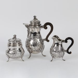 Antikes 3-tlg. Rokoko-Kaffeeservice mit aufwendigem Reliefdekor, Paris, Frankreich, 1768–17751.200,00 €Silver alloy; total weight: approx. 1134 g; three-piece coffee service with encircling relief floral and rocaille decoration to the front and several large reserves with Watteau-style scenes: 1) Coffee pot with pear-shaped body on three splayed feet, scrolled ear handle of ebonised wood (upper attachment requires tightening), hinged domed lid with rose finial and high-set spout; height: approx. 22.5 cm. 2) Cream jug with pear-shaped body on three splayed feet, high-set scrolled ear handle of ebonised wood and broad spout; height: approx. 12.7 cm. 3) Sugar bowl with compressed globular body on three scrolled feet and removable lid with rose finial; height: approx. 13.2 cm. All pieces with age-related signs of wear; underside stamped with crowned Bourbon fleur-de-lis and two town or poinçon de charge marks “A” and “P” beneath a trefoil crown (see photos).