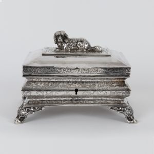 Antike Zuckerdose aus Adelshaushalt, um 1800420,00 €Silver alloy; weight: approx. 345 g; antique rectangular sugar box with curved sides, hinged stepped lid with finial in the form of a stylised Cavalier King Charles Spaniel and double scrolled thumb rests, standing on four scrolled volute feet, probably later applied; encircling finely chased floral decoration to the body; centrally inset keyhole to the front, key missing; underside with engraved numbering; dimensions: approx. 13 x 18 x 13 cm.