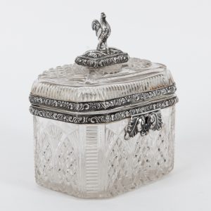 Zuckerdose aus Kristallglas mit silberner Hahnbekrönung, Frankreich, 19. Jh.280,00 €Silver alloy; total weight: approx. 926 g; octagonal sugar box made of crystal glass cut in various ornamental patterns, with silver rim mount and finial; straight-sided body with rear-hinged domed lid surmounted by a sculptural, stylised rooster finial; centrally inset keyhole to the front, key missing; age-related signs of wear and discolouration; dimensions: approx. 11 x 13.2 x 9.1 cm.