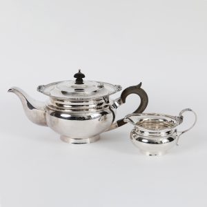 Silberne Teekanne mit Rahmgießer, S. W. Smith & Co., London, England, 1913920,00 €Sterling silver; total weight: approx. 1023 g; 1) Teapot with compressed globular body on a broad foot ring, centrally applied ear handle with floral carved decoration in ebonised wood, drawn-in shoulder, pronounced spout, rear-hinged lid with mushroom-shaped finial of ebonised wood, and broad spout rim with encircling floral decoration and reeded lines; minor nicks to the body of up to approx. 1 mm and age-related signs of wear; body stamped with lion passant, town mark, maker’s mark and date letter, underside numbered; height: approx. 14.3 cm. 2) Cream jug with compressed globular body on a broad foot ring, drawn-in shoulder, high-set volute handle with floral decoration and reeding continuing from the lip, and spout indentation; age-related signs of wear; height: approx. 8.7 cm.