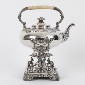 Viktorianischer Tee- bzw. Wasserkessel, um 19001.400,00 €13-lot silver; total weight: approx. 1679 g; kettle and stand/burner with encircling relief and finely chased floral decoration; kettle with compressed globular body on a circular base, centrally applied scrolled spout and high-set swivel handle with Bakelite grip, removable domed lid with finial of ebonised wood and silver, and two mounts on each side of the shoulder for suspension in the stand; height: approx. 17.5 cm; stand with laterally scrolled supports and pierced floral decoration on a rounded rectangular base with circular aperture for a removable spirit burner with wick; height: approx. 19.1 cm; age-related signs of wear, one support requires tightening; kettle and stand each stamped to the underside with fineness marks; total height: approx. 26.5 cm.