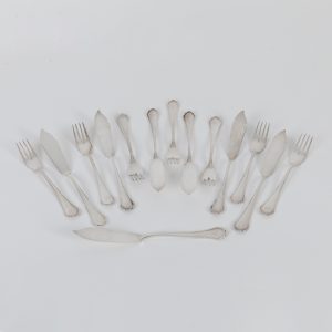 Fischbesteck für 7 Personen mit Chippendale-Dekor, BSF, Bremen, 20. Jh.500,00 €800/- silver; total weight: approx. 647 g; fish cutlery set for seven persons with classic Chippendale decoration; minimal age-related signs of wear; stamped to the reverse of the handles with crescent and crown, maker’s mark and fineness mark; length of the forks: approx. 17.5 cm; length of the knives: approx. 21.3 cm.