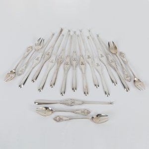 19-teiliges Konvolut Austern- und Hummergabeln, Wilkens & Söhne, Bremen, 20. Jh.380,00 €800/- silver; total weight: approx. 669 g; group comprising: 1) 6 oyster forks with floral and ornamental decorative elements and alloyed monogram “MV”; age-related signs of wear; reverse stamped with crescent and crown, maker’s mark and fineness mark; length: approx. 13.5 cm. 2) 13 lobster forks with alloyed monogram “MV” to the widened central section; some tines bent and age-related signs of wear; reverse of the handle stamped with crescent and crown, maker’s mark and fineness mark; length: approx. 20.1 cm.