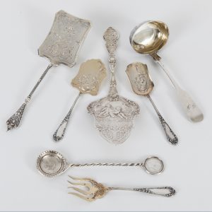 7-teiliges Konvolut antiken Vorlegebesteckes, meist Deutschland, 18.–19. Jh.160,00 €Various silver alloys; total weight: approx. 283 g; seven-piece group comprising: 1) Historicist pie server with chased floral, ornamental and beaded border decoration; reverse of the blade stamped with crescent and crown, fineness mark “800” and maker’s mark A. C. Frank, Hamburg, Germany; length: approx. 20.3 cm. 2) Pastry server with relief decoration of putti, floral and fruit motifs to the front; reverse stamped with a struck punch and fineness mark “800”; length: approx. 22.5 cm. 3) Sugar shovel with finely chased floral and rocaille decoration; tongue stamped with crescent and crown and fineness mark “800”; length: approx. 13.5 cm. 4) Sweet server with floral and rocaille decoration; blade stamped with crescent and crown and fineness mark “800”; length: approx. 13.8 cm. 5) Small fish serving fork with four curved tines; shaft stamped with crescent and crown and fineness mark “800”; length: approx. 13 cm. 6) Commemorative spoon with twisted stem and two Venezuelan coins mounted at both ends; length: approx. 16.3 cm. 7) Ladle with engraved initials “E. S.” to the front of the handle end; reverse stamped “Bluhm” and fineness mark “750”; length: approx. 17 cm.