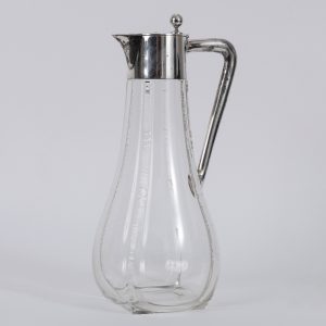 Henkelkaraffe mit Silbermontierung im Jugendstil, Deutschland, um 190020,00 €800/- silver and colourless cut glass; total weight: approx. 1191 g; decanter with quatrefoil, pear-shaped body, vertically ornamentally cut, on a square base with angular handle, spout, hinged lid with mouth and spherical thumbpiece in silver; lid engraved “H.Y.C. Alster 25.7.1909”; on the side of the lid stamped with crescent and crown, a partially struck unidentified maker’s mark, model number and fineness mark; solder residues on the centre of the lid, isolated enclosed foreign inclusions in the glass, chip in the glass measuring approx. 1 cm, heavy oxidation traces, wear to the base; height: approx. 31 cm.