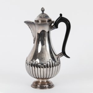 Silberne Kaffeekanne, Charles Boyton & Son, London, England, 1899330,00 €Sterling silver; total weight: approx. 360 g; silver coffee pot with baluster-shaped body and encircling reed decoration to the lower section, on a domed double-stepped foot; high-set ear-shaped handle made of ebonised wood; hinged domed lid with ornamental decoration and finial-shaped handle; pointed spout with ornamental and floral decoration; age-related signs of wear, fine scratches to the body measuring approx. 7 cm; tarnish-protected; stamped at the side of the neck with lion passant, town mark, maker’s mark and date letter; height: approx. 23.1 cm.