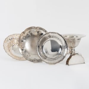 5-teiliges Konvolut div. Gefäße und Serviettenhalter, WMF, Geislingen an der Steige, 20. Jh.80,00 €Plated; total weight: approx. 1.58 kg; assortment consisting of: 1) Napkin holder with hammered décor in a fan shape on four compressed spherical feet; stamped on the underside with manufacturer’s mark “WMF”; height: approx. 7.4 cm. 2) Mounted bowl with cylindrical, vertically gadrooned wall and flared lip rim, tapered shaft and circular base; height: approx. 12.8 cm. 3) Serving bowl on three ball feet with openwork ornamental décor on the flared rim; tarnish protection on the underside partially worn; height: approx. 6.2 cm; diameter: approx. 21.1 cm. 4) Octofoil serving bowl with hammered décor on three ball feet; stamped on the underside with manufacturer’s mark “WMF”; height: approx. 6 cm; diameter: approx. 24.5 cm. 5) Small fruit bowl with strongly flared rim with openwork ornamental décor on four stylised shell-shaped feet; stamped on the underside with manufacturer’s mark “WMF”; height: approx. 8.7 cm; diameter: approx. 25 cm. Assortment with age-related signs of wear.
