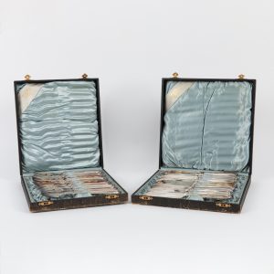 Fischbesteck für 12 Personen mit Perlranddekor, WMF, Geislingen an der Steige, um 1900280,00 €Plated; total weight: approx. 1.57 kg; 24-piece service, “Perlrand” pattern; handles with encircling pearl border decoration and fine ornamental and floral decoration on the visible side of the blade and bowl respectively; stamped at the junction of the bowl or balance with manufacturer’s mark and “I/O”; in original cases by jeweller Chr. Herpich, Altona; age-related signs of wear and in part heavy oxidation residues; length of knives: approx. 20.3 cm; length of forks: approx. 18.5 cm.