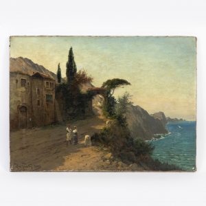 Gogarten, Heinrich (1850 – 1911)Oil on canvas; landscape painting in local colours; depiction of a southern mountain village situated along a coastline, in front of a mountain range extending to the horizon, with a traditionally dressed couple conversing on the village’s main path in the foreground at sunset, standing next to the sea cliff; signed and dated lower left “Henri Gogarten 1886”; paint losses along the frame edges; fine craquelure; various restoration traces as well as patch repairs affixed to the reverse; age-related surface yellowing; not opened; image dimensions: approx. 46.5 cm x 65 cm; weight: approx. 1 kg.