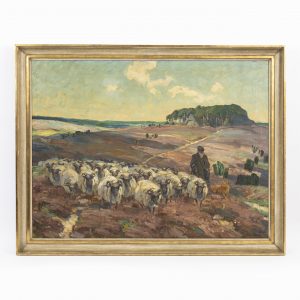 Prediger, Hermann (1886-1979)Oil on canvas; “Schnuckenherde” from September 1928; fauvist landscape painting; depiction of a shepherd accompanied by a dog with his herd in the foreground, behind a flat field landscape of the Lüneburg Heath, in the background a farmhouse situated at the edge of a forest under a slightly cloudy sky; impasto application of paint; signed, dated and inscribed “Bispingen” lower right; reverse of stretcher with two adhesive labels, one with the artist’s biography and one with the painting’s title and date; minor paint losses and age-related signs of wear; wide, curved gold- and beige-toned wooden frame with some losses; not opened; image size: approx. 75.5 x 101 cm; frame size: approx. 87 x 111 cm; weight: approx. 5.8 kg.