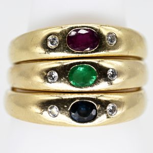 3 verschiedene Bandringe, jeweils mit Saphir, Rubin und Smaragd und seitlich je 1 Brillant, 80er Jahre620,00 €Stamped: 585/- yellow gold; total weight: approx. 8.6 g; classic narrow band ring form; on the top side each with a horizontally set oval faceted sapphire, ruby and emerald in partly intense colour varieties with visible inclusions, flanked on both sides by one brilliant-cut diamond, total approx. 0.06 ct; colour and clarity: mid range; dimensions of the ring centre: approx. 4.6 mm, height: approx. 2.6 mm; ring size: 53.5; surface with visible signs of wear.v