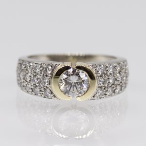 Bandring mit 37 Brillanten, zus. ca. 1,16 ct, 1990er Jahre1.200,00 €585/- white and yellow gold; total weight: approx. 4.5 g; stylised band ring design with a centrally set brilliant-cut diamond in a lateral, semi-arched setting; continuing along each shoulder with 18 pavé-set brilliant-cut diamonds; total of 37 brilliant-cut diamonds approx. 1.16 ct; colour: Wesselton; clarity: IF; dimensions of the ring head: approx. 6.7 mm; ring size: 50.5.