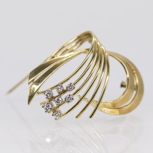 Kometen-Brosche mit 7 Brillanten, zus. ca. 0,3 ct, 1970er Jahre330,00 €585/- yellow gold; total weight: approx. 8.6 g; curved design composed of six fan-shaped wires and two bands; at the end of the comet’s tail, 7 raised prong settings each holding a brilliant-cut diamond, total approx. 0.3 ct; colour: F-H; clarity: VVSI; dimensions: approx. 29.9 x 38.5 mm; height: 8 mm.