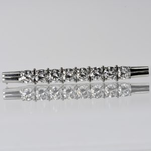 Prunkvolle Stabnadel mit 8 Brillanten, zus. ca. 3,98 ct, 1980er Jahre3.600,00 €750 white gold; total weight: approx. 9.8 g; 8 adjacent claw settings in a slight lateral curve, each set with one brilliant-cut diamond, total approx. 3.98 ct (according to engraving); colour: F-H; clarity: VVSI-VSI; short profiled end pieces on each side; double-secured stick pin; dimensions of the pin: approx. 6.3 x 56.2 mm; height: approx. 4.5 mm.