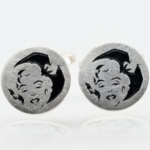 Paar Manschettenknöpfe mit Vexierbild, Goldschmiedearbeit, N. M., 21. Jh.190,00 €Stamped: 925/- silver; total weight: approx. 12.5 g; pair of cufflinks with round front, featuring an illusion image in black lacquer, inlaid with several bats forming the contour of Marilyn Monroe’s face; fixed connecting bar; folding faceted high-oval toggle; diameter: approx. 29.2 mm; length: approx. 20.3 mm.