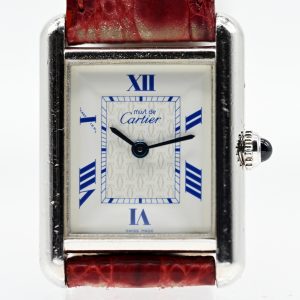 Damenarmbanduhr, Modell Tank, Must de Cartier, Paris, 20. Jh.580,00 €Stamped: 925/- silver; quartz; white enamel dial; cornflower blue Roman numerals and blued hands; ref. no.: 074205PL; original burgundy reptile-embossed leather strap (with visible signs of wear); original folding clasp by Cartier in steel; case dimensions: approx. 29.6 x 22.2 mm: case with signs of wear; no guarantee on movement or function; documentation of general overhaul by Cartier/Hamburg from 2016; no papers or box present, red suede-look pouch with faint gold logo by Cartier.