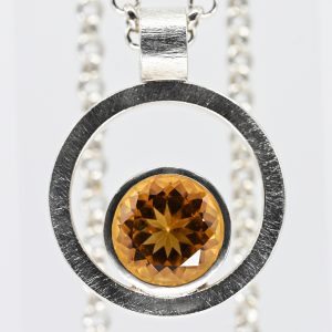 Moderner Anhänger mit Citrin an Erbsenkette, Goldschmiedearbeit, N. M., 21. Jh.440,00 €Stamped: 925/- silver; total weight: approx. 40.4 g; pendant in double ring form with a wide bezel setting and faceted citrine; satin-finished surface decoration; fine belcher chain with lobster clasp; height of the pendant (incl. bail): approx. 39.4 mm; diameter of the chain links: approx. 4 mm; chain length: approx. 45.5 cm.