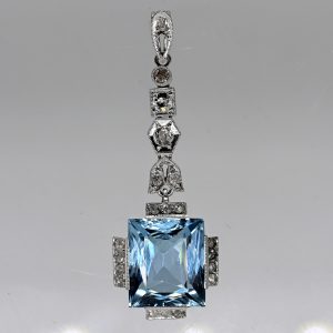 Anhänger mit hellblauem Farbstein und ca. 20 Melée- und Altschliff-Diamanten, Art-Déco Stil480,00 €Unmarked; 585/- white gold; total weight: approx. 4.3 g; elongated, articulated design; individual vertically arranged elements and setting structures in various geometric forms and sizes; contoured with a total of approx. 20 melee and old-cut diamonds, total approx. 0.1 ct; colour and clarity: middle to lower range; at the end of the pendant a set light blue coloured stone in rectangular, stepped, faceted form; dimensions: approx. 11.7 x 10.1 mm; height: approx. 6.7 mm; total pendant length: approx. 4 cm.