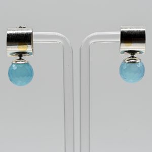 Paar Ohrstecker mit facettierten Calcedon-Kugeln, Goldschmiedearbeit, N. M., 21. Jh.230,00 €Stamped: 925/- silver and yellow gold; total weight: approx. 12.1 g; elongated, two-part rectangular form with satin-finished surface decoration and a geometric pattern worked in yellow gold; upper section in open semi-arched form with attached round faceted chalcedonies in an intense light blue hue; total length: approx. 27.5 mm; width: approx. 11.7 mm.