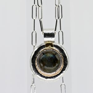 Avantgardistischer Anhänger mit Labradorit an feinem Silbercollier, Goldschmiedearbeit, N. M., 21. Jh.400,00 €Stamped: 925/- silver and yellow gold; total weight: approx. 48.1 g; round domed setting in yellow gold and silver with hammered decoration; elliptical bail bezel setting with labradorite cabochon; elongated anchor chain with lobster clasp; polished reverse; diameter of the pendant: approx. 35 mm; height of the pendant incl. bail: approx. 47.4 mm; length of the necklace links: approx. 14.2 mm; total necklace length: approx. 63 cm.