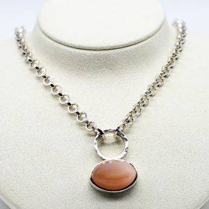Anhänger mit rosafarbenem Mondstein an Ösenkette, Goldschmiedearbeit, N. M., 21. Jh.480,00 €Stamped: 925/- silver; total weight: approx. 50.9 g; oval pendant of two-part form with a pink moonstone in a silver bezel setting beneath a ring with hammered decoration; fine oval-link chain, attached to the ring at two points; lobster clasp; dimensions of the pendant: approx. 35.4 x 25.6 x 14.4 mm; diameter of the chain links: approx. 6.4 mm; chain length: approx. 50 cm.