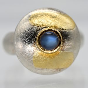 Avantgardistischer Ring mit Goldelementen und kleinem Mondstein, Goldschmiedearbeit N. M., 21. Jh.370,00 €Stamped: 925/- silver and yellow gold; total weight: approx. 18.4 g; wide ring band with a mushroom-shaped centre featuring amorphous gold plating and a gold bezel setting with a small moonstone cabochon showing strong adularescence; satin-finished surface; diameter of the ring centre: approx. 19.6 mm; diameter of the stone: approx. 6 mm; ring size: 53.5.