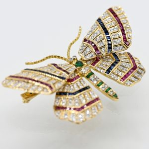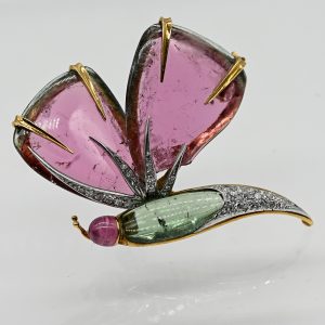 Große Schmetterlingsbrosche mit Wassermelonen-Turmalin und 34 Brillanten, gestempelt Kern 1040, 90er Jahre600,00 €750/- yellow gold; total weight: approx. 14.9 g; stylised, semi-plastic butterfly; body and wings made of cut watermelon tourmalines; outlined with a total of 34 brilliant-cut diamonds, total approx. 0.32 ct; colour: G-I; clarity: VS-SI; reverse stamped: Kern 1040; dimensions: approx. 38.9 x 54.4 mm.