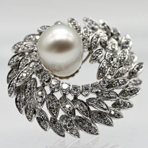 Brosche mit Südsee-Perle, ca. 138 Melée-Brillanten und 19 Brillanten, zus. ca. 1,4 ct, 80er Jahre1.400,00 €750/- white gold; total weight: approx. 13.3 g; triple stepped spiral form composed of stylised leaves and claw settings; set with approx. 138 melee brilliant-cut diamonds and 19 brilliant-cut diamonds, total approx. 1.4 ct; colour: G-H; clarity: VS-SI; centrally set drop-shaped South Sea pearl; silvery-grey with iridescent mother-of-pearl lustre and small natural surface characteristics; diameter: approx. 31.4 mm; height: approx. 17.1 mm.