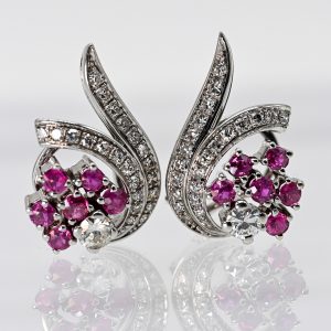 Paar Ohrclips mit 12 hochfeinen Rubinen, 2 Brillanten und 44 Melée-Brillanten, Juwelierarbeit, 80er Jahre1.100,00 €750/- white gold; total weight: approx. 9.7 g; curved form with 7 composite claw settings and 2 asymmetrically attached bands; set with 12 fine rubies, total approx. 1.3 ct; 2 brilliant-cut diamonds, total approx. 0.46 ct; colour: E-F; clarity: VVS-VS; 44 melee brilliant-cut diamonds, total approx. 0.56 ct; colour: F-H; clarity: VS (upper range); maker’s mark on the reverse; dimensions: approx. 22.6 x 14.9 mm.
