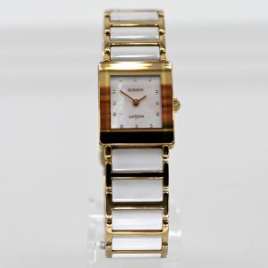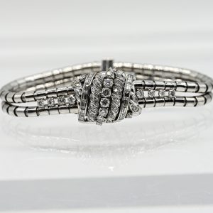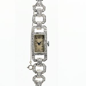 Schmuckarmbanduhr mit 51 Brillanten und 14 Diamant-Baguettes, zus. ca. 3 ct, bezeichnet Gübelin, 50er Jahre2.900,00 €Platinum; total weight: approx. 50.3 g; central section in a stylised knot design at the beginning of the bracelet, richly decorated with 51 brilliant-cut diamonds and 14 baguette-cut diamonds, total approx. 3 ct; colour: G-H; clarity: VVS-VS; hinged cover with underlying square dial, baton indices and linear hands; double-row bracelet composed of individual, joined, barrel-shaped links; safety folding clasp; dimensions of the watch centre: approx. 20 x 51.3 mm; height: approx. 10.3 mm; total length: approx. 19.5 cm; no guarantee on movement or function.