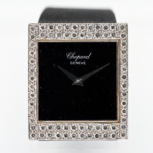 Vintage Armbanduhr mit Onyx, Diamanten besetzte Lünette- und Stiftschließe, zus. ca. 1,5 ct, CHOPARD, Genève, 20. Jh.2.900,00 €Case and pin buckle in 18 kt (750/-) white gold; black textile strap; total weight: approx. 35.3 g; manual winding movement, calibre Frédéric Piguet 21; rectangular case; square dial in black onyx with white gold-coloured arrow-shaped hands; bezel set with approx. 68 diamonds; pin buckle set with 31 diamonds, totalling approx. 1.5 ct; colour and clarity in the upper range; serial number: 94877; reference number: H 2204/1; case dimensions: approx. 30.4 x 26.6 mm; height: 5 mm; minor signs of wear; no guarantee on movement or function; original case; no papers.