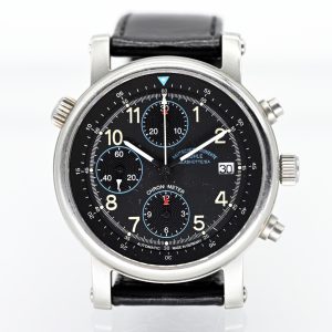 Herren-Chronograph, Mühle, Glashütte, Cockpit Timer, Stahl, Automatik, 20. Jh.1.200,00 €Satin-finished stainless steel case; case diameter without crown: 40.3 mm; case height: 13.2 mm; smooth, satin-finished stainless steel bezel; black leather strap with pin buckle; lug width: 20 mm; black dial with Arabic cream-coloured numerals and white hands; automatic movement; central hour and minute hands; small seconds with hacking function for precise time setting at 9 o’clock, date display with quickset at 3 o’clock, adjustment of the internal rotating bezel via setting crown at 10 o’clock; scratch-resistant sapphire crystal; screw-down crown; screw-fastened stainless steel case back with sapphire crystal display window; weight of the watch including strap: 93.2 g; reference number: M13193; limited to 999 examples; rare collector’s piece; no guarantee for movement or functionality.