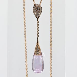 Anhänger mit Amethyst-Pampel und 46 Melée-Diamanten, zus. ca. 0,46 ct, Carl Bucherer, Schweiz, 21. Jh.600,00 €Stamped: 750/- rose gold; total weight: approx. 4.9 g; elongated pendant in a double drop form; pendant bail and capsule set with a total of approx. 46 small melee diamonds, total approx. 0.46 ct; colour and clarity: upper range; connected by a fine anchor chain matching the necklace; pendant length: approx. 45 mm; total necklace length: approx. 40 cm.