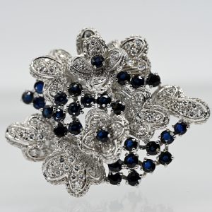 Große Blütenbrosche mit 28 Saphiren und ca. 100 Brillanten, zus. ca. 3,5 ct, Juwelierarbeit, 80er Jahre3.500,00 €Stamped: 750/- white gold; total weight: approx. 36.7 g; composed of individual, stepped elements in the form of blossoms and leaves; set with approx. 100 brilliant-cut diamonds, total approx. 3.5 ct; colour and clarity: upper range; contoured by 28 sapphires in individual prong settings; intense blue colour variety with round faceted cut; double pin stem; dimensions of the brooch: approx. 49.4 x 58.1 mm; height: approx. 20.9 mm.
