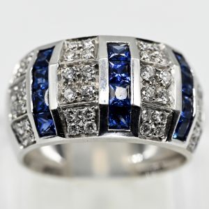 Breiter, massiver Bandring mit 12 Saphir-Carrées und 48 Melée-Brillanten, zus. ca. 0,7 ct, 21. Jh.1.400,00 €Stamped: 750/- white gold; total weight: approx. 13.6 g; wide, solid ring design with triple stepped profile; front divided into 7 vertical sections; alternating with 3 linearly set sapphires, a total of 12 carré-cut stones in an intense blue colour variety; separated by 4 sections each set with 3 x 4 melee brilliant-cut diamonds, total approx. 0.7 ct; colour and clarity: upper range; width of the ring head: approx. 12 mm; height: approx. 4.5 mm; ring size: approx. 55.